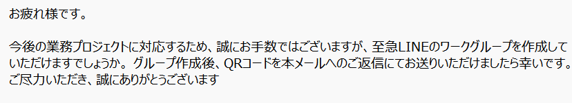 現在、当社代表者名を騙り、LINEグループの作成・QRコードの送信などを求める不審なメール(いわゆる「なりすましメール」)が複数送信されている事案を確認しております。